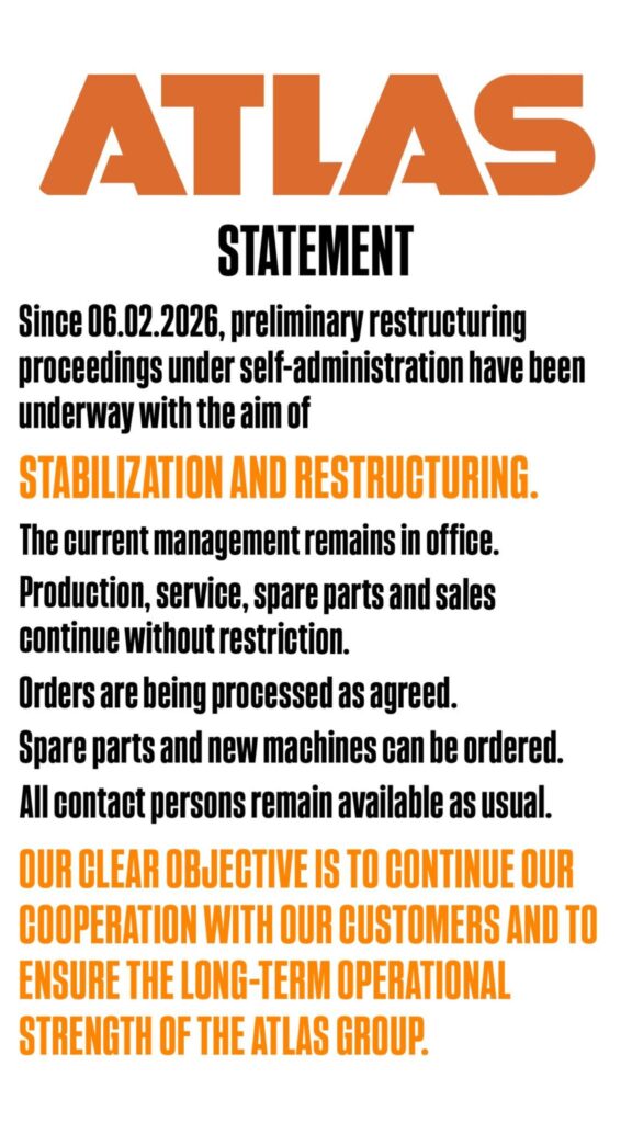 Den tyska maskintillverkaren Atlas GmbH har ansökt om att försättas i rekonstruktionsförvaltning. Företaget ansökte om så kallad självförvaltning (rekonstruktion) den 9 februari vid Delmenhorst tingsrätt i norra Tyskland. Detta följde konkursdomstolens beslut om att göra det den 6 februari 2026.