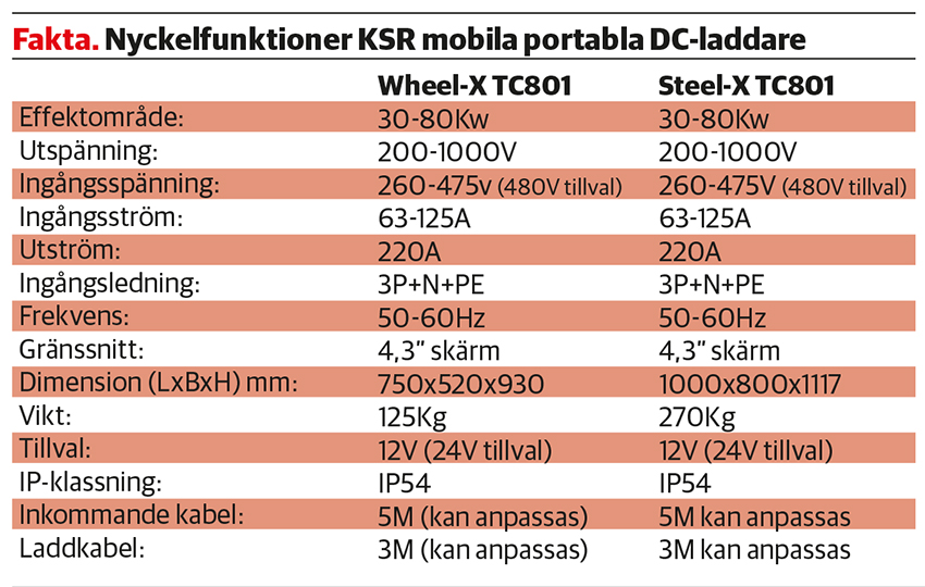 Först ut är modellerna KCR Power Wheel-X som är en mobil DC-laddare tillverkad i kraftig rörkonstruktion med stora hjul, kabelhållare och uppges vara byggd för att enkelt flyttas mellan arbetsplatser.