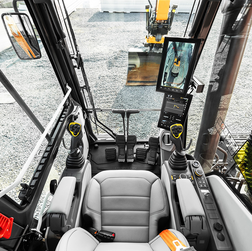 Develons säkerhetssystem, som är tillval, är baserat på en AI-driven plattform med sex kameror och tre radarsensorer som övervakar området runt maskinen i 360 grader och detekterar rörelse inom ett avstånd på 13 meter.