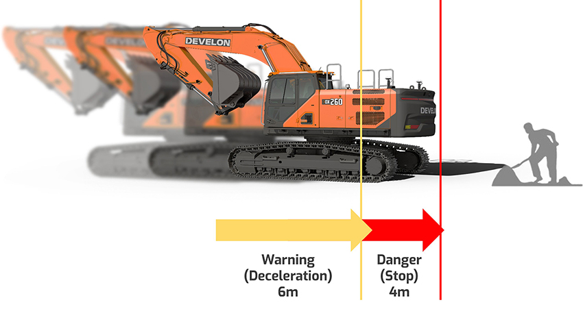 Arbetsområdet runt maskinen är indelat i två definierade zoner. Från ett avstånd av sex meter utlöses varningar och automatisk hastighetsminskning. Inom fyra meter stoppas sväng- och backningsfunktionerna automatiskt.