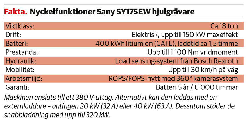Sany SY175EW är en elektrisk hjulgrävare i 18-tons klassen, utrustad med ett 400 kWh litiumjonbatteri och en elektrisk motor med upp till 150 kW maxeffekt. Kombinationen ger hög prestanda med ett vridmoment på upp till 1 100 Nm, samtidigt som maskinen erbjuder tyst drift och lokalt emissionsfri körning. Med en topphastighet på upp till 30 km/h på väg är maskinen anpassad för arbeten som kräver både rörlighet och flexibilitet.